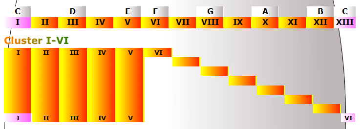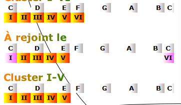 Initialement, le cluster I-VI dispose de six éléments groupés. Le dernier degré va vers l’octave...