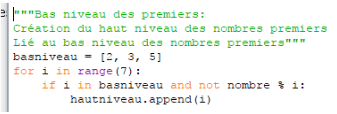 Un nombre est incrémenté pour être comparé, le motif de comparaison est pour le cas le reste de la division. Ainsi pour un nombre « uz » comme unique argument de la recherche des communs, a un nombre incrémenté auquel il opère « if not uz % iep ». Si « uz % iep » égale zéro, c’est qu’il s’agit d’un sous-multiple. Étant donné que la recherche s’effectue sur les préalables premiers, autant ajouter à la condition « if », ceci « and iep % 6 in (1, 5) ». Cette opération produit le reste comme précédemment, avec diviseur le six filtrant le type correspondant aux valeurs un ou cinq. Cette comparaison { Nombre % Multiple | Multiple % 6 } revient souvent, comme on peut le voir sur le code…