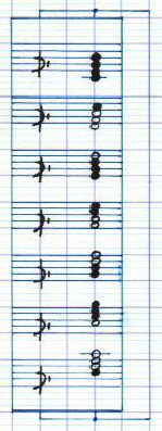 La gamme de DO majeur.Se compose de sept notes, leur développement ajoute sept modes( ou ) degrés : I, II, III, IV, V, VI, VII. I >>>>>>> ionien : I mj7 II >>>>> dorien : II -7 III >>>> phrygien : III -7 IV >>>>>>> lydien : IV mj7 V > mixolydien : V 7 VI >>>>> aéolien : VI -7 VII >>>>>>>> locrien : VII -7b5, ou bien, VII ø7 ( demi diminué )