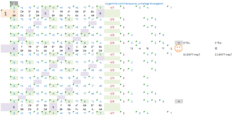 À partir de cette originalité tonale, la gamme chromatique se commatise. La ligne horizontale a une tonique comme première tonalité, puis une double série de formes numériques. Une fois que toutes les lignes horizontales comportent les tonalités, on voit qu’elles ne sont pas diatoniques entre-elles. Si bien, que chaque ligne précise une gamme unique