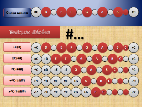 Les toniques diésées déclarent être des degrés diatoniques, dévoilant ainsi la forme renversée d’une gamme fondamentale. La ligne que décrit la suite des toniques diésées, suit un parcourt croissant. Assignant ainsi à des gammes fondamentales, un cycle ordonné sur l’algorithme des toniques. Qui fait cette suite de gammes : -3, +45x, ^4, ^3, °45x. Si, musicalement, on fait suivre ces gammes. On peut dire, qu’on suit un ordre tonique « augmenté ».