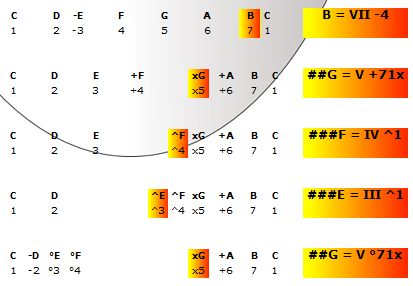 En ayant porté sur la note tonique une seule altération, nous avons crée une formule à forte modulation majeure. Le cas est différent avec les autres degrés, puisque l’altéraction altérative est en plein espace d’octave.