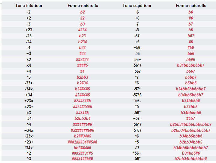 1- La forme élémentaire, qui inclut aussi des signes altéractifs. Soit, quand il est dit #3, il est naturel de définir la quarte augmentée (#4). La force altéractive étant limitée aux taux de (maxi/mini) compressions,elle sait également cumuler les valeurs. Dans la forme élémentaire, se cachent des signes sous-entendus. S’ils ne se voient pas, ils se devinent...